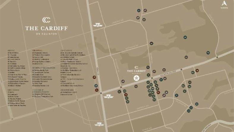 Cardiff Condos由历有25年经验的建筑商Sierra Building Group打造,位于Eglinton Ave E/Bayview Ave和Yonge之间(492 Eglinton Avenue East), 豪宅区Lawrence Park边上, 全楼高12层,共92个户型,其中包括Condo和TH,东北南三项基本无遮挡, 豪宅区极为稀少的物业!
