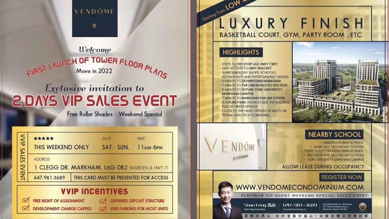 Vendome Condos公寓地处万锦市中心,位于Highway7 / Warden。由H&W Developments开发的全新公寓和联排别墅。公寓由两栋组成,共计535个单位。该公寓预计完工日期是2020年。