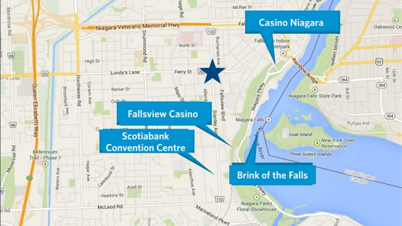 酒店地理位置极其优越,距离瀑布最佳观景点步行仅需约1500米,离区内最大的赌场也是举步可达,这在面积仅约200平方公里的尼亚加拉城内可谓寸土寸金。酒店占地面积约1.21英亩(约中国7.35亩),6层楼高,建筑面积约60,000平方尺(约合5,574平方米),以及95个停车位,酒店新建于2008年,状态极佳。