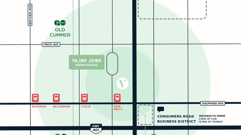 Verdé毗邻Consumers Road 商业区,这个区域北达SheppardAve East,南临Hwy 404,西以Hwy 404为界,东以Victoria Park Ave为止。总占地100公顷。这里被业界称之为“Consumers next” ,是目前多伦多市中心以外最大的商业区,现有18000余名员工在这里工作,预计在未来25年内,该区域将会达到34,000多个就业岗位。另外,多伦多政府正致力于进一步扩张 Consumers Road 商业区,为未来的城市发展提供更多的就业和商业机会。