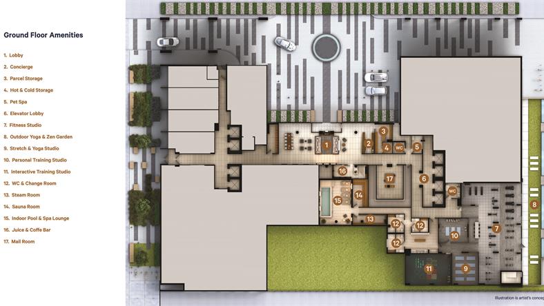 此外,大楼配有7/24小时循环保安服务,公寓配有四部特别定制的高速电梯,尽量缩短住户电梯间等待的时间。大楼还配有健身房,运动室,瑜珈室,设有男女分开的蒸汽房,酒吧,银屏,火炉等的聚会室。还有图书馆,乒乓室,棋牌室。影视室,音乐室,和游戏室。楼顶层更有露天休闲区和BBQ设施,以及特大露天游泳池。