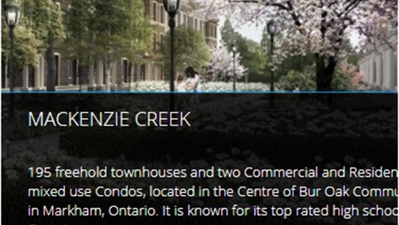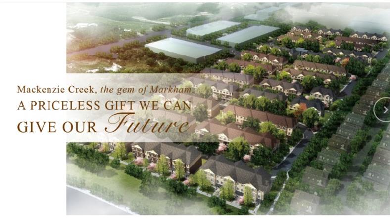“还未开盘,Mackenzie Creek项目已经接到上千名客户的网上预订申请。Mackenzie Creek项目具有得天独厚的区位优势。该项目位于万锦市中心黄金地段,Major Mackenzie Drive & Markham Road的西南角,占地约16.33英亩,万锦市作为大多伦多地区的新兴城市以及地产发展热点,在过去的数年中已经成为地产消费者和地产投资者眼中的“香饽饽”。这些年来,包括IBM、Blackberry在内的众多高科技企业相继落户万锦市,使其蜕变为金马蹄地区声名显赫的科技之都、技术之都,而本地区优美的自然环境,醇厚的人文艺术气氛,又让万锦市成为蜚声加国的文化之城、艺术之都
