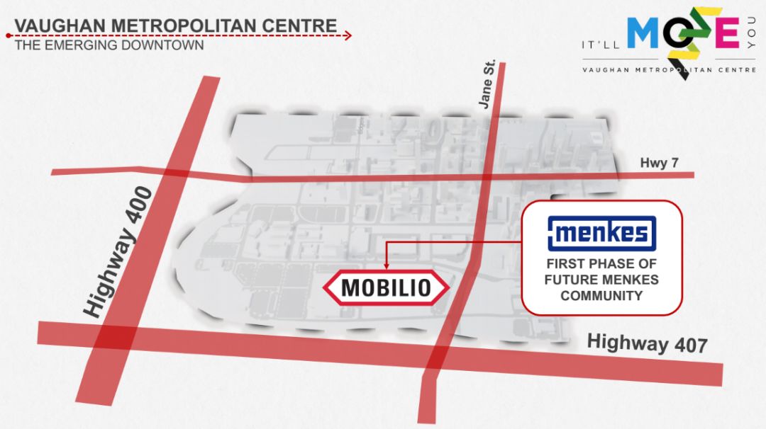 本期介绍的公寓楼盘是又一位于旺市的靠近VMC的地铁公寓楼盘:Mobilio Condos。该楼盘坐落于Vaughan Metropolitan Centre地铁站南边,步行约10分钟可以到达。该地铁站公共交通总站,坐地铁7分钟即可到达约克大学!必将又是学生住房热点!除此之外,楼盘靠近Hwy 7,400高速和407高速,出行十分方便。