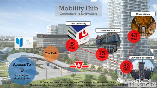 与规划中的旺市地铁站(Vaughan Metropolitan Center)为邻,特设专属地下连接直通地铁总站。家门口有Viva / York Region巴士总站,毗邻Hwy400、Hwy427、Hwy407高速。五分钟到约克大学。地点,地点,地点!Transit City楼群才是旺市真正的王者!