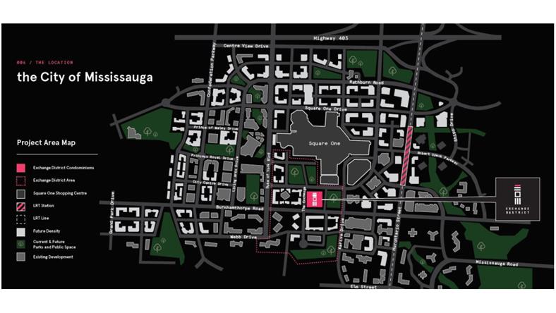 Exchange District Condos近邻Mississauga市政中心,可尽享区内市政设施:步行: 5分钟到 Square One购物中心,5分钟到 Sheridan College,未来会有轻轨和LRT站 。