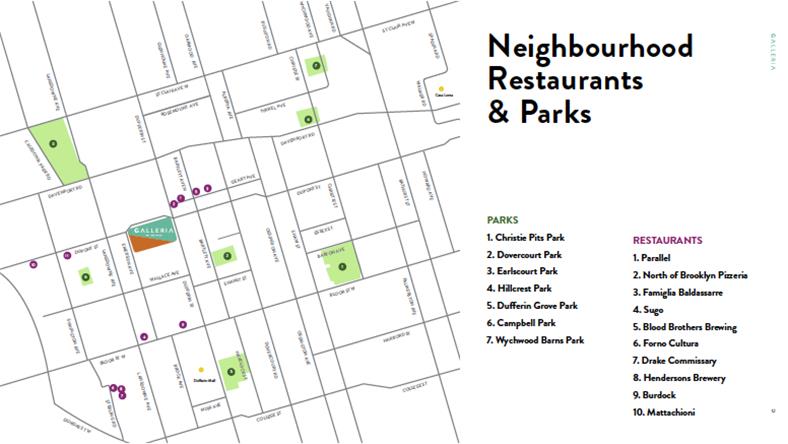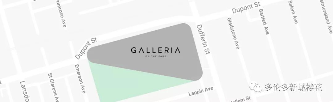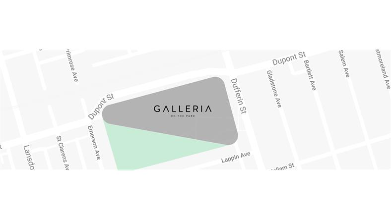 Galleria On the Park 位于Dufferin和Dupont Street的交汇处、Galleria购物中心的现址,距离Dufferin TTC地铁站仅有数分钟路程。 步行4分钟可达Wallace-Emerson 社区中心;