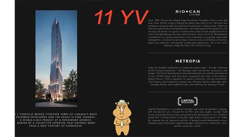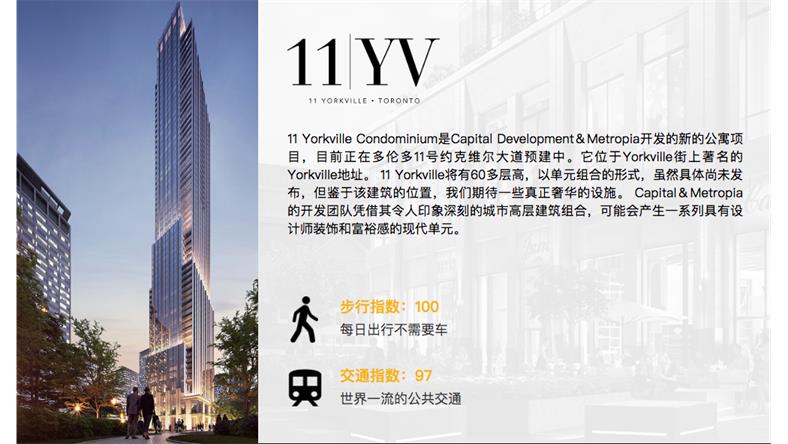 11 YV Condos是由著名开发商Metropia, Capital Developments and RioCan强强联手在Yorkville社区的倾力巨作。Yorkville可以说是多伦多吸引高收入精英人群最昂贵和最顶级社区,其地位等同于纽约的第五大道!这个社区的人均收入高达$179,859,大大的高出了多伦多其他地区的平均水平。和著名的四季酒店(Four Season Hotel)隔街相望, 11YV Condo将在这里拔地而起创造62层高的新时代奢华艺术,汇集了多伦多时尚最前沿和最具人气的购物,餐饮,娱乐休闲场所,并在其中大放异彩,熠熠生辉。