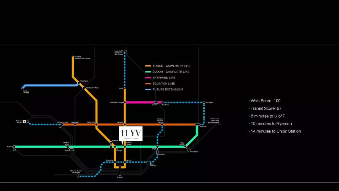 11 YV 多伦多最贵最顶级公寓之一,世界顶级品牌店林立。您可漫步于Hermes, Holt Renfrew, Gucci,或Louis Vuitton等高尚名店,可谓是多伦多最繁华的地段,媲美纽约的第五大道。入住Yorkville让高端人士梦寐以求,是身份象征。11 Yorkville Condos也是可能是入住Yorkville尊贵社区最后一个新建项目。