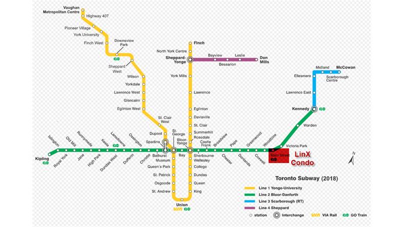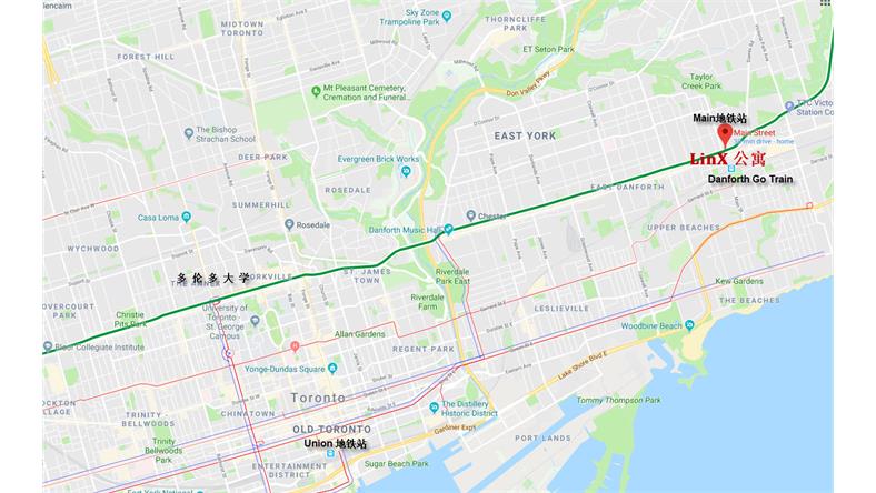 LinX Condos 所处社区Danforth Village属于东约克的翻新改建社区。 楼盘地理位置佳,交通便捷,周边餐厅和娱乐场所很多,公共交通发达。乘坐地铁二号线,17分钟直达市区多伦多大学St George站,乘坐Danforth Go Train, 17分钟直达市区Union Station. 该楼盘必将会是一个学生和年轻白领工作的首选的租房之地。