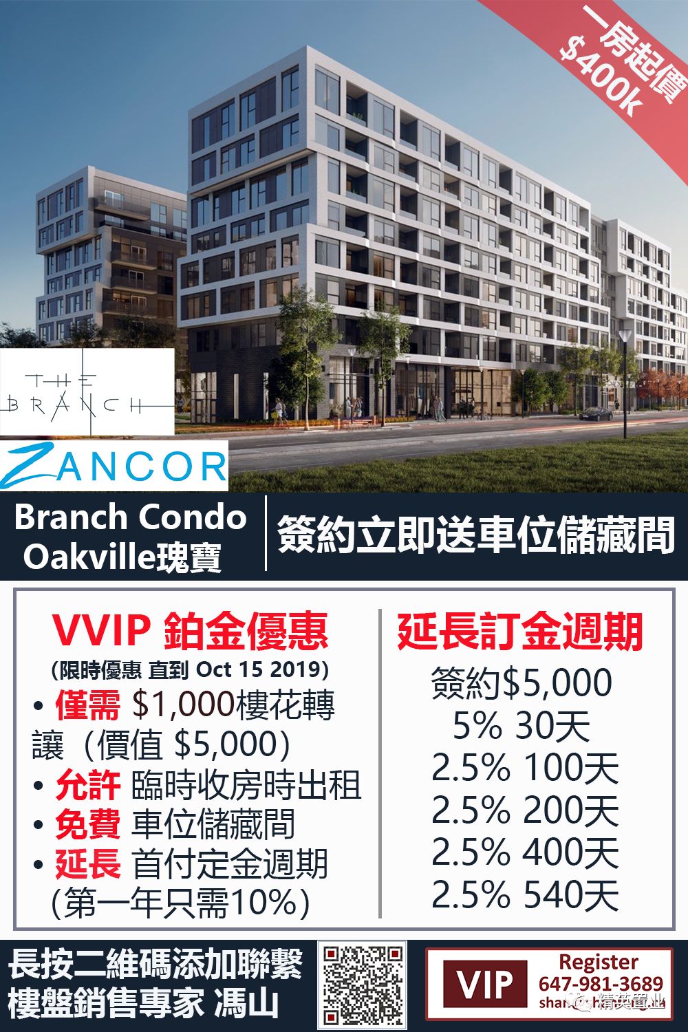 The Branch Condo 由知名发展商 Zancor Homes 打造,位于Oakville这个人口20几万的小城市。Oakville是GTA的瑰宝,2018年被Money Sense杂志评为最适合居住的城市!The Branch Condo将成为GTA瑰宝中的瑰宝!The Branch Condo建筑面积将会26,903平方米!整个公寓设施将包含操场,游泳池,Spa,BBQ Place等等综合娱乐设施于一体!交通极其便利!The Branch Condo会连接4个主要高速公路和两个Go Train Station可以令居住Branch Condo的人方便的到达两个国际机场!所以Branch Condo是您远离城市喧嚣的好选择!