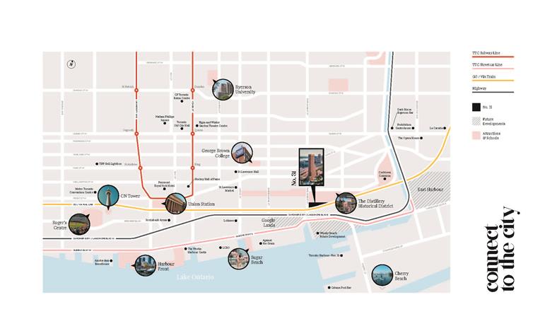 1. 步行者的天堂– 居住在老酿酒区的核心地段为生活提供了超级便利,No 31 Condos 的周围遍布多伦多最好的饭馆,酒吧,商店和各种娱乐设施。 2. 超级便利的交通–居住在No 31 Condos的居民可以迅速搭乘TTC街车,20分钟内及可到达Union Station 和Downtown各个核心地区。开车数分钟可上Gardiner和DVP高速。 3. 无敌湖景– No 31 Condos 的居民数分钟即可到达多伦多市中心的码头,沙滩,公园,享受无与伦比的安大略湖美景。 4.巨大升值空间– 坐拥Downtown核心地段和无敌湖景,伴随人口和城市的发展,Google科技城仅的入驻,No 31 Condos在未来数年内必定升值巨大,投资自住两相宜。 5. 著名的开发商– No 31 Condos是由著名开发商 Lanterra Developments 倾情打造,是杰出品质和优质服务的保证。 1