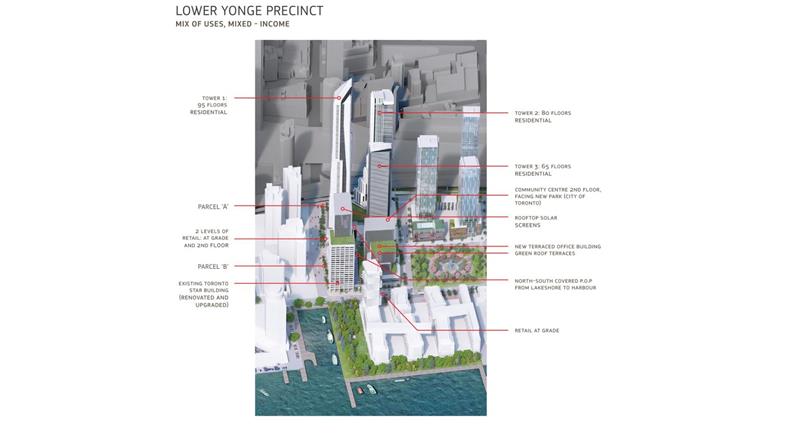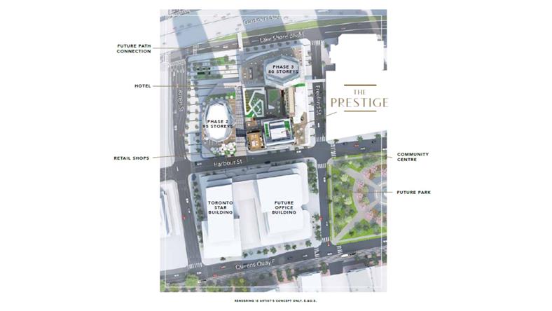 项目将建在多伦多最令人向往的地址之一湖滨Yonge街。开发商将在这里建立一个非凡的新社区,楼塔中建一个2.5英亩的园林设计公园,居民尽享优美风景。