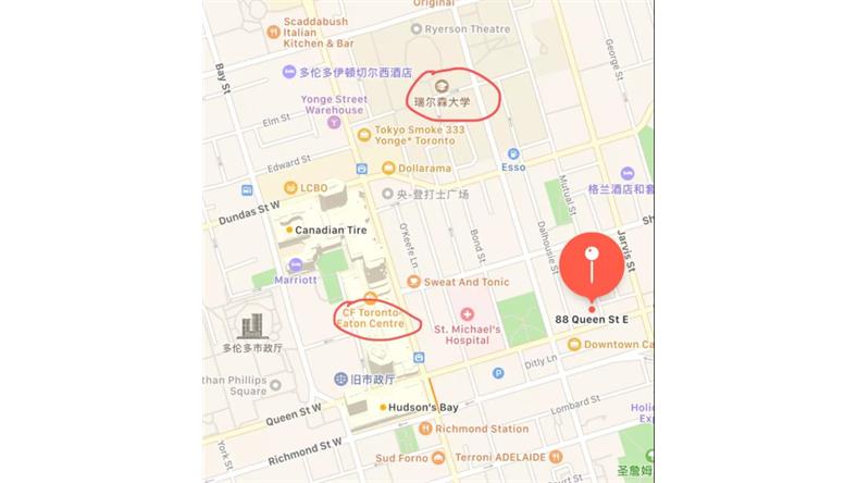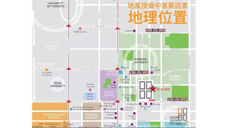 楼盘的地理位置十分优越,多伦多龙脉Yonge街及多伦多金融中心就在其西边,楼盘还紧邻Ryerson大学和乔治布朗学院,其中Ryerson大学在校学生38000人,教职人员1700人,这庞大的学生数字就距离88 Queen公寓仅3分钟的步行距离,只相距250米。乔治布朗学院在校学生28000人,教职人员1339人,距离88 Queen公寓仅8分钟步行距离,相距850米。 步行3分钟至,Ryerson大学,相距250米 步行4分钟至,Eaton伊顿购物中心,相距350米 步行5钟至,Dundas广场,相距450米 步行6分钟至,Yonge& Queen地铁站或Yonge&Dundas地铁站,相距500米 步行8分钟至,Nathan Phillips广场和Old City Hall,相距650米 步行9分钟至,多伦多核心金融区,相距700米 步行10分钟至,George Brown College乔治布朗学院,相距850米 步行13分钟至,Loblaws大型超市 步行20分钟至,OCAD安省艺术设计大学 步行23分钟至,多伦多大学