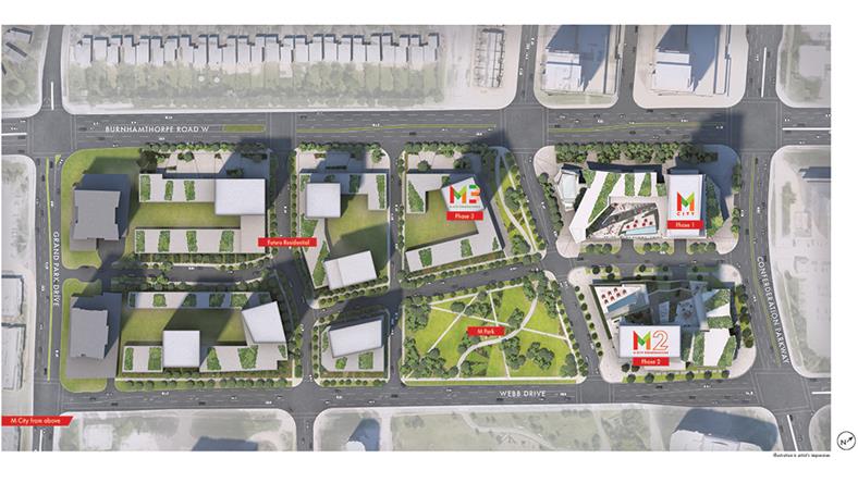 M City的设计由总部位于纽约的建筑工作室Cooper Robertson与Donald Clinton联合设计。主塔楼将紧邻市政厅和由省府全资兴建的13亿加元的轻轨地铁。M City的配套设施包括延伸现有市区街道,创建一个街区网,打造更适合步行的社区环境,住宅街区的双向车道上将设街头停车区,以及大量人行步道等。