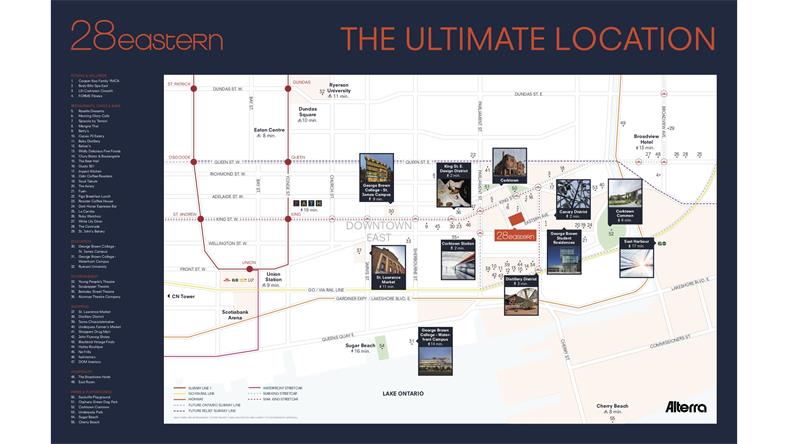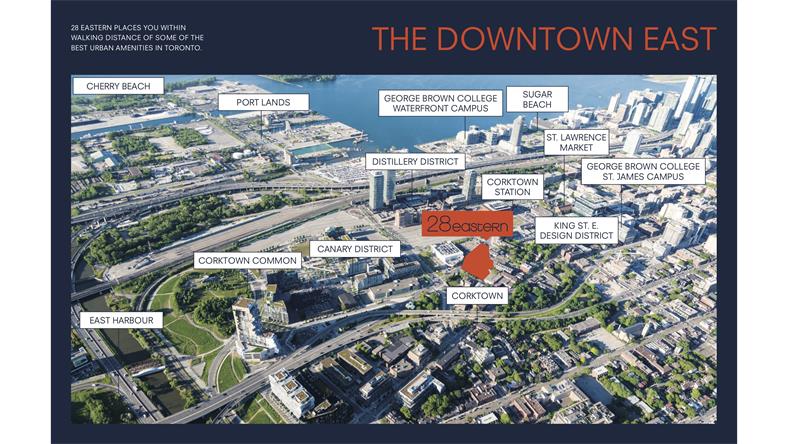 项目简介 项目名称: 28 Eastern Condos 楼盘地址: 28 Eastern Ave, Toronto, ON M5A 1H5 开发商: Alterra Group 建筑设计: Teeple Architects, Landscape Alexander Budrevics & Associates 楼层及单位:12层379个单位 户型:公寓Studio -3 Bed + Den, 镇屋2Bed -4Bed+Den 主要路口:Cherry St & Front St 入住时间:2024年夏天 28 Eastern Condos是由Alterra公司开发的最新公寓项目,位于多伦多的Cherry St 和FrontSt E的交界处。楼盘南面是安湖和未来科技区,西面就是多伦多金融区,与CN Tower两两相望,东面蓄势待发East Harbour,北面Corktown。这一特殊的中心位置和周边未来发展的关系,决定了28 Eastern必然成为万众瞩目的焦点。多伦多东港最精致艺术楼盘28 Eastern,眺望CN Tower及璀璨夺目市中心金融区美景,百万级夜景属于你! 28 Eastern 在Front&Cherry Street的交接处,这里曾是大英帝国最大的酿酒厂,19世纪全球最大威士忌生产商的Gooderham and Worts Distillery坐落于此,如今完好保留了许多19世纪30年代到60年代的维多利亚式厂房,成为北美保存最好的维多利亚时代工业区。 后来的后来,政府重资把此处改造为多伦多独具艺术气息,文化,和娱乐的保护区,许多博物馆,美术馆,咖啡馆和高档小资餐厅都在此周围。整个区域古色古香,精致小资的浪漫街道,沿路设有24小时有轨电车,8分钟直达金融街!而举步可达南边的湖滨改造计划也为此开凿了无限生机潜能!2分钟至未来Corktown地铁站,未来轻轨沿线也将选址于此公寓不远处,这里是历史与未来的交界点。 位置便利 1分钟至King Streetcar 2分钟至未来地铁站Corktown Station 2分钟至Canary District 2分钟至DVP 3分钟至酿酒区,周边生活便利,饭馆,酒吧,商店和各种娱乐设施近在咫尺 6分钟至Gardiner Expressway 8分钟至有轨电车 10分钟至圣乔治学院两大校区 11分钟至St Lawrence Market 11分钟至Ryerson University 17分钟至东港环保湖滨专线 18分钟至PATH地下城 毗邻waterfront,码头,沙滩,公园,享受无与伦比的安大略湖美