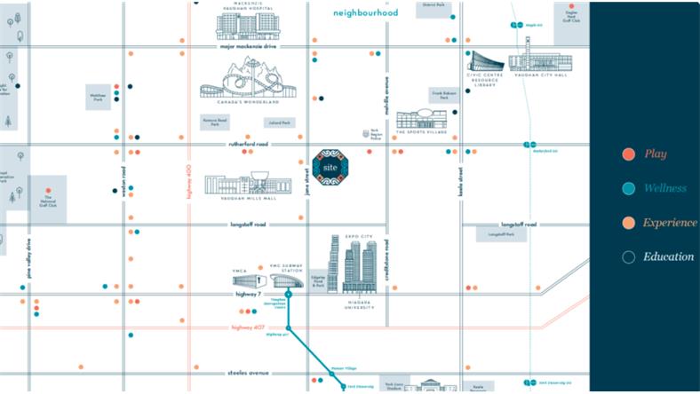 生活宝地,吃喝玩乐一应俱全 旺市作为加拿大发展最快的区域之一给便利生活带来了无限可能。Abeja District坐落于旺市市中心,邻近400高速,5分钟即达Wonderland,6分钟即达York大学,7分钟即达Vaughan Mills购物中心及Vaughan Metropolitan Centre。同时VMC是York – Spadina地铁线的终点站,地铁贯穿整个多伦多线路,方便通勤,不管你想去哪里都十分便利。