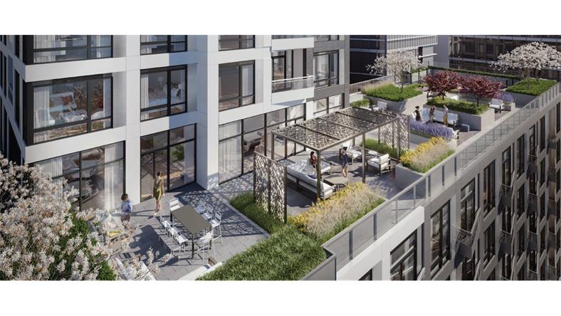 Empire外观设计极为现代简美,使用多层淡色材料构成黑白美学。金属灰白质感的外墙搭配黑框玻璃窗,以及半切高层塔楼,不仅设计感十足,还结合了区域高科技的视觉理念。大楼第二层的公共设施包括健身房,瑜伽室和宴会室。而在12层,有室内厨房/宴会厅,可通向室外半切式高空露台,其中包括座位,用餐区,烧烤炉和狗狗跑道。