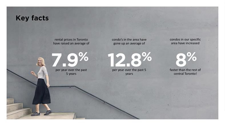 多伦多的租金价格在过去5年里每年平均提高了7.9% 该地区的公寓在过去5年里每年平均上涨了12.8% 在JAC周边的公寓在过去5年每年增加8%,比多伦多中心地区增长得更快。 临近各大学府和市中心办公楼,各大公园也是数步之遥。所以说JAC绝对是市中心楼花投资的首选!