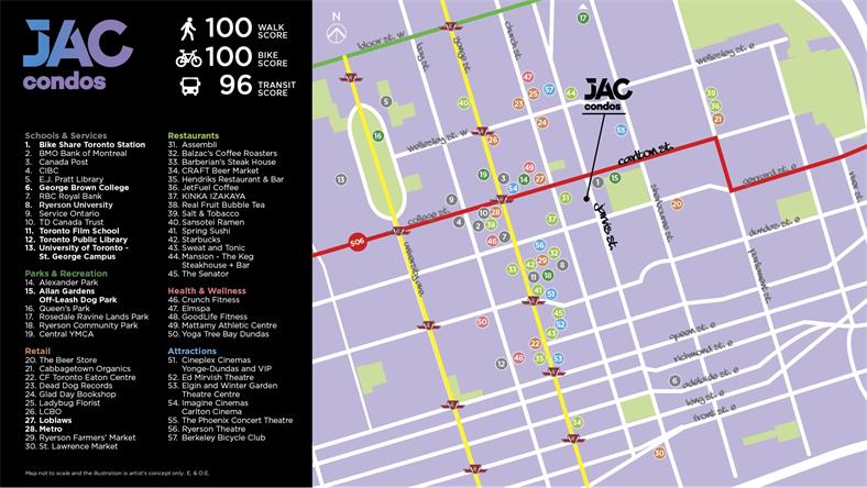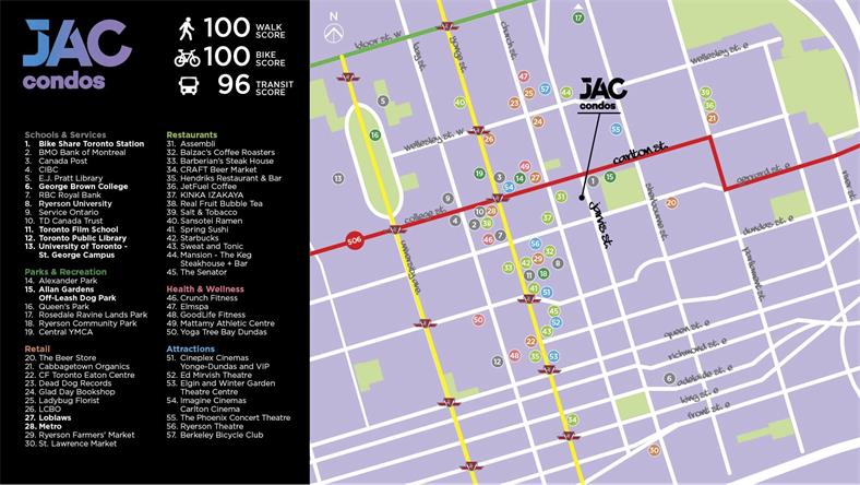 JAC Condos公寓楼花地理位置极佳,步行出行评分96/100,搭乘公共交通出行评分100/100 大楼门口就是Javis Street Bus巴士车站 步行5分钟可至College地铁站 步行5分钟可至 Loblaws, Joe Fresh & the LCBO 距离瑞尔森大学仅有200米 步行5分钟可至 Mattamy Athletic Centre体育中心 步行8分钟可至Yonge Street Subway College地铁站 步行11分钟可至Dundas Square广场和CF 多伦多Eaton中心 近多伦多大学、乔治布朗学院、OCAD 近Mattamy Athletic Centre体育中心 近多伦多金融中心 近购物及餐饮中心 近DVP和QEW高速