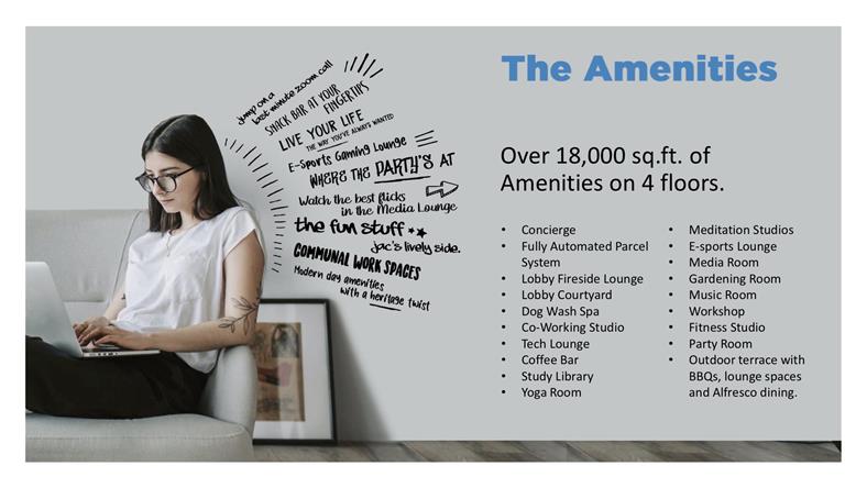 24小时礼宾、 全自动打包系统、 休息室、 宠物spa、联合办公的工作室、 科技休息室、 咖啡吧、 学习图书馆、 瑜伽室、 冥想工作室、 电子竞技休息室、 媒体室、 园艺室、 音乐教室、 workshop、 健身工作室、 聚会的房间