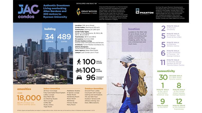 楼盘名称:JAC Condos 开发商 : Graywood Developments & Phantom Developments 地址 : 308 Jarvis St, Toronto 主路口: Jarvis St & Carlton St 价格 : 40余万起 楼层: 34层 预计入住 : 预计2024年初 JAC Condos是加拿大知名开发商Graywood Developments在多伦多市中心开发的豪华公寓楼花,位于多伦多市中心的Church and Wellesley社区,近Jarvis St和Carlton St的交界处,步行可达College地铁站,怀尔逊大学,乔治布朗学院以及多伦多大学。社区繁华充满活力,周边设施完善,步行指数96/100。举步前往购物中心,电影院,健身房,餐厅等娱乐休闲场所。十分方便,不需要任何代步工具。公共服务设施也一应俱全,学校,托儿所,社区服务中心,图书馆也都同样步行可达。楼盘四通八达,给学生和附近上班的人员大幅度地减少了通勤的时间,同时距离大楼 30步之遥的便是多伦多历史最久的公园之一Allan Gardens。 黄金地理位置