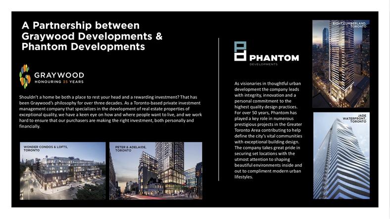 Greywood Development 是具有三十年历史的开发商。它的总部位于多伦多,专门从事加拿大和美国市场的优质房地产的投资、开发和管理业务。他们独特的专业知识涵盖了从获取开发场地,交易承销和结构设计到开发管理各个方面的大量服务,包括土地使用批准,项目设计,销售,市场营销,施工管理和项目融资。他们的设计不仅满足当今的需求,而且专注于确保蓬勃发展的未来。 公司实力雄厚,已在大多伦多地区建造了众多高标准、高品质的住宅单位,其中最为闻名的包括位于Wellington Street W.的Ritz Carlton住宅项目、Lake Shore Boulevard W.的Ocean Club Waterfront Condominiums、Fashion District内的 The Mercer项目、和 5 St. Joseph Street上的Five Condos 。至今为止Graywood已开发了29,200套住房,涉及多个资产类别,包括住宅,低层房屋,中高层公寓,酒店和退休住宅,总价值超过69亿美元。目前有超过4,200个单位(400万平方英尺)正在开发中,价值超过30亿美元。 付款方式