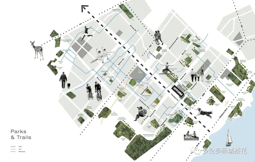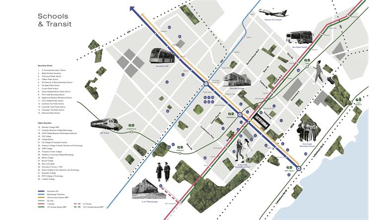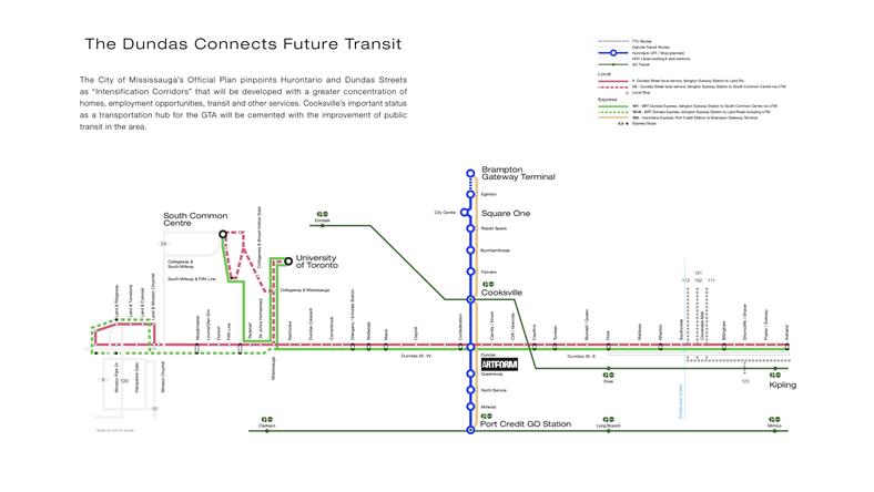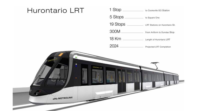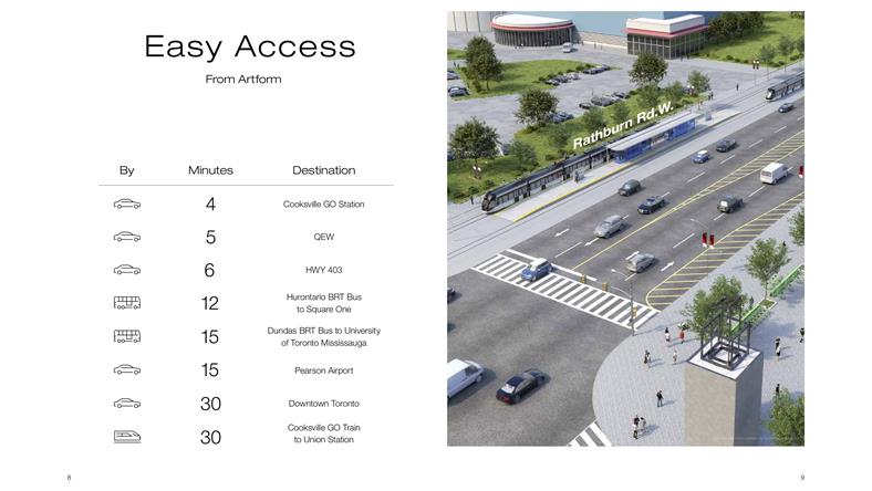 距离Cooksville Go Station仅一步之遥,30分钟即可到达多伦多市中心,出门即上高速QEW、HWY403、401以及427 处于Dundas Connection Project范围内,未来城市发展规划的中心区域,距离未来轻轨Dundas站也仅300米 近Square One商圈,从Artform 公寓楼花驱车至Square One仅需5分钟的时间,生活购物便利 搭乘公共交通10分钟直达多伦多大学密西沙加校区,驱车仅需5分钟 8分钟可至大统华超市 10分钟到达黄金广场、Dixie Outlet Mall商场、CF Sherway Garden商场 15分钟可至多伦多皮尔逊国际机场 驱车或搭乘Go Train 30分钟可至多伦多市中心 离“动漫哈佛”Sheridan College开车10分钟 Hurontario轻轨共计18公里长,总共19个站点,目前正在由Metrolinx建设中,预计2024年投入使用,Artform同年入住。 Hurontario & Hwy 10上的新轻轨将于Cooksville Go火车站相连,预计2024年通车,Dundas St上的BRT新公交车也将于TTC相连,未来这里的交通将更加便捷。