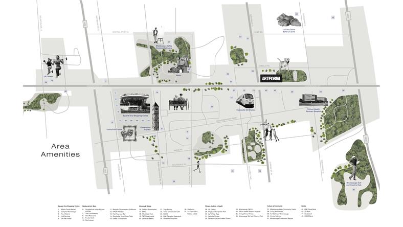 周边休闲娱乐中心一应俱全 Playdium Park 密西沙加Cineplex电影院 Living Arts Centre Sky Zone蹦床公园 Canlan Sportsplex 体育中心 从日常休闲到亲子活动场所 让您与家人共享欢乐时光 Artform Condos周围还有着不少口碑相当不错的学校,公立私立,小学中学大学,都任君选择! 公寓设计: