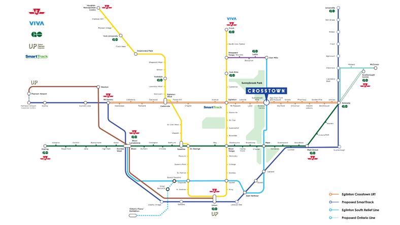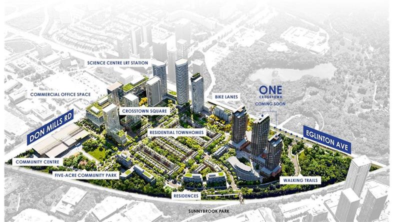 Crosstown这个全新开发的大型社区位于Eglinton/Don Mill交叉路口,上可至北约克市中心,下可至多伦多 Downtown,占地60英亩,是多伦多地区最好的社区之一。整个社区包括使用绿色环保建材的300,000平方英尺的商业办公写字楼和社区中心,公寓住宅,以及大面积的公园和绿地。社区中心配有最齐全的现代化设施,2个溜冰场、游泳池、瑜伽室,会议室等等。社区内还设有Rippleton Ps/St、Bonaventure、Don Mills/York Mills Hs等多个私立和公立学校。同时,附近还有多个文化场所,如安大略科学中心,日本加拿大文化中心及Aga Khan博物馆,使孩子们可以得到足够的艺术熏陶。而更令人兴奋的是楼下直通公交站和未来轻轨LRT站,为城市东西通勤的人口节省了60%的时间。