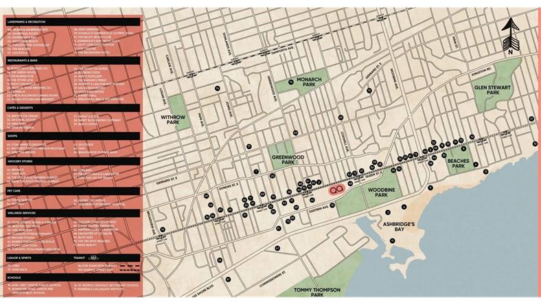 Queen Street East为Queen Ash Bridge Condos的居民提供了各种各样的生活设施。许多购物,餐饮和娱乐都在步行范围内。