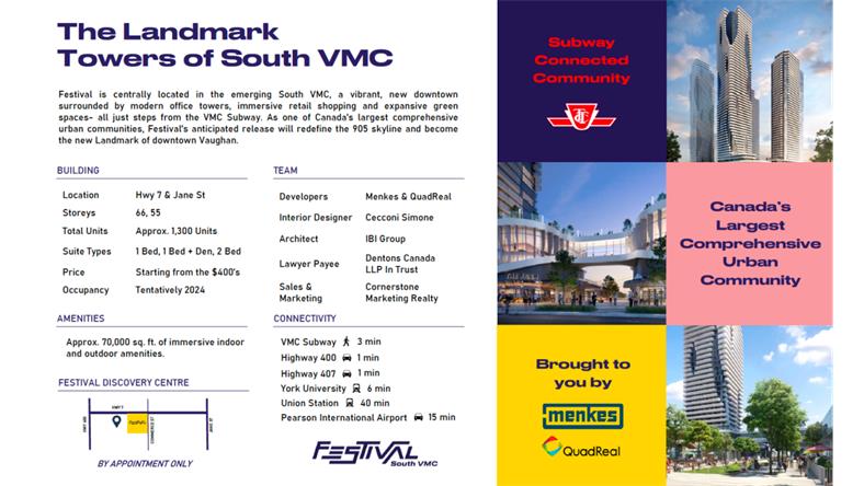 Festival就位于 VMC的TTC 地铁站附近一个交通枢纽地带,步行去VMC地铁站仅需8分钟,在这里还有VIVA,YRT和ZUM公交系统也为人们提供服务。去Richmond Hill和Brampton,Markham等周边地区都十分便捷!