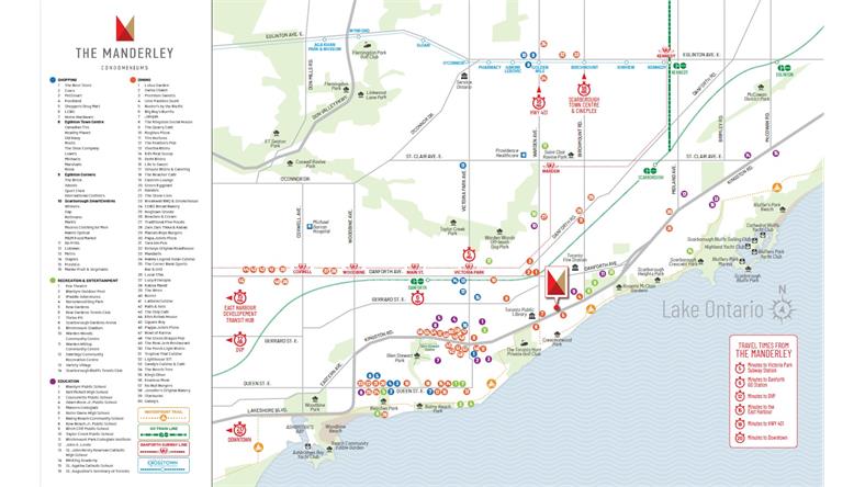 The Manderley Condos位于Warden Ave和Kingston Rd交界处,距TTC公交站仅几步之遥,数分钟即可到地铁站,精品店,餐馆,娱乐场所和高速公路,生活极为便利。不到半个小时就可到多伦多市中心,大量的工作机会可供选择。最令人惊喜的的是,不到10分钟,你就可以漫步于美丽的公园,享受安大略湖的美丽风光,体验生活的悠然自得和畅快淋漓。