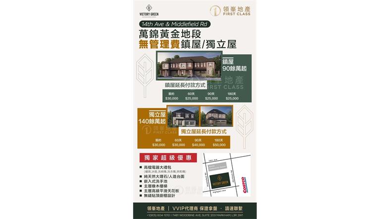 项目名称| Victory Green 具体地址| 5685 14th Ave, Markham 交叉路口| Middlefield Road & 14th Avenue 户型单位| 镇屋/独立屋 开发商| Fulton Group 付款方式 详情请联系多伦多楼花销售冠军冯山,您的置业好靠山!更多资讯、更优价格、更好楼盘!请联系:647-806-8188(国,粤,英皆可)更多详情,请联系微信: fengshanxiaohao