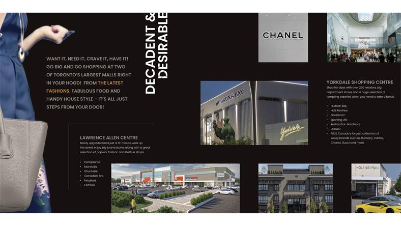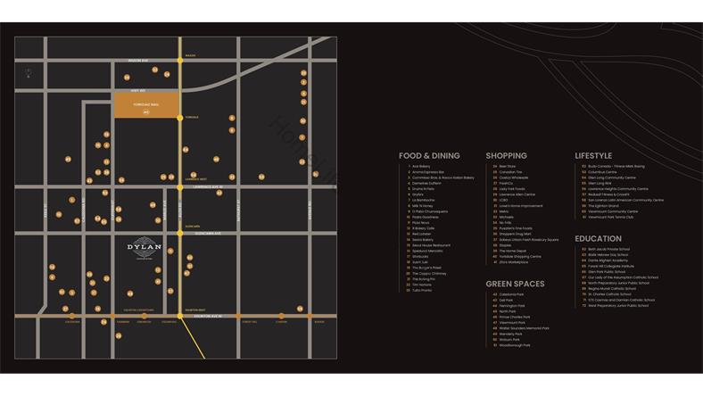 The Dylan Condos位于北约克商业核心地带,Yorkdale Glen Park社区。该区域地理位置绝佳,生活便利,公寓周边围绕众多商家,满足居民餐饮、银行、购物、娱乐等基本需求。公寓步行10分钟内可达三个地铁站Glencairn Station、 Eglinton West 及Lawrence West,该地区还有用优质私校Fieldstone Private School和早教中心,以及Joseph D. Carrier 艺术馆。除了丰富的人文环境,公寓周围绿地环绕,公寓附近的Viewmount Park与Wenderly Park为居民提供了天然氧吧。 公寓设施