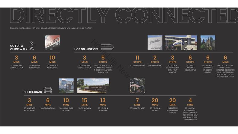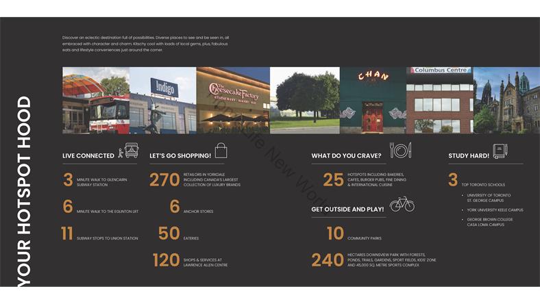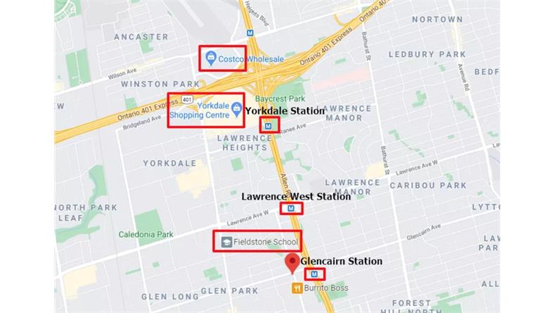 - 楼下即是公交站 - 步行仅3分钟至Glencarin地铁站 - 步行10分钟至Eglinton LRT轻轨站 - 轻松前Allen Rd和HWY 401/400/404 - 乘坐地铁3分钟即可到达Yorkdale购物中心 - 距约克大学15分钟车程或5个地铁站 - 5个地铁站,直达St.George站 - 半小时内直达多伦多市中心联合车站 - 附近的许多学校,如Glen Park公立学校和Damian天主教学校 - 10分钟至Eglinton West 及Lawrence West 地铁站 - 距多伦多最大的城市公园Downsview Park有10分钟路程 - 附近的公园包括 Downview Park, G Ross Lord Park, Earl Bales Park and Edward Gardens等 社区环境