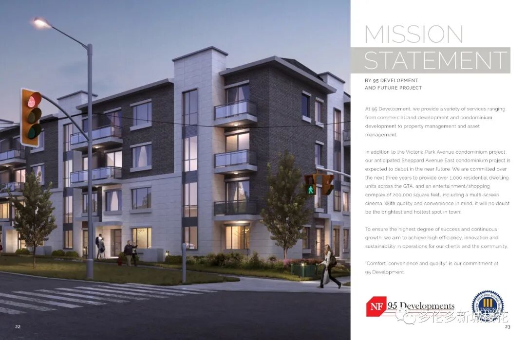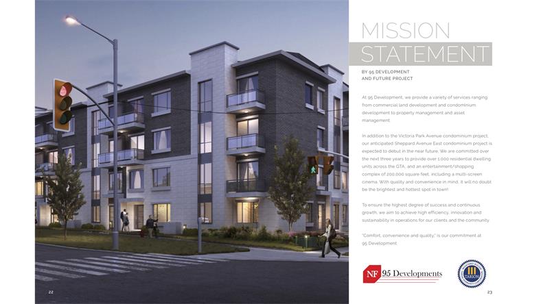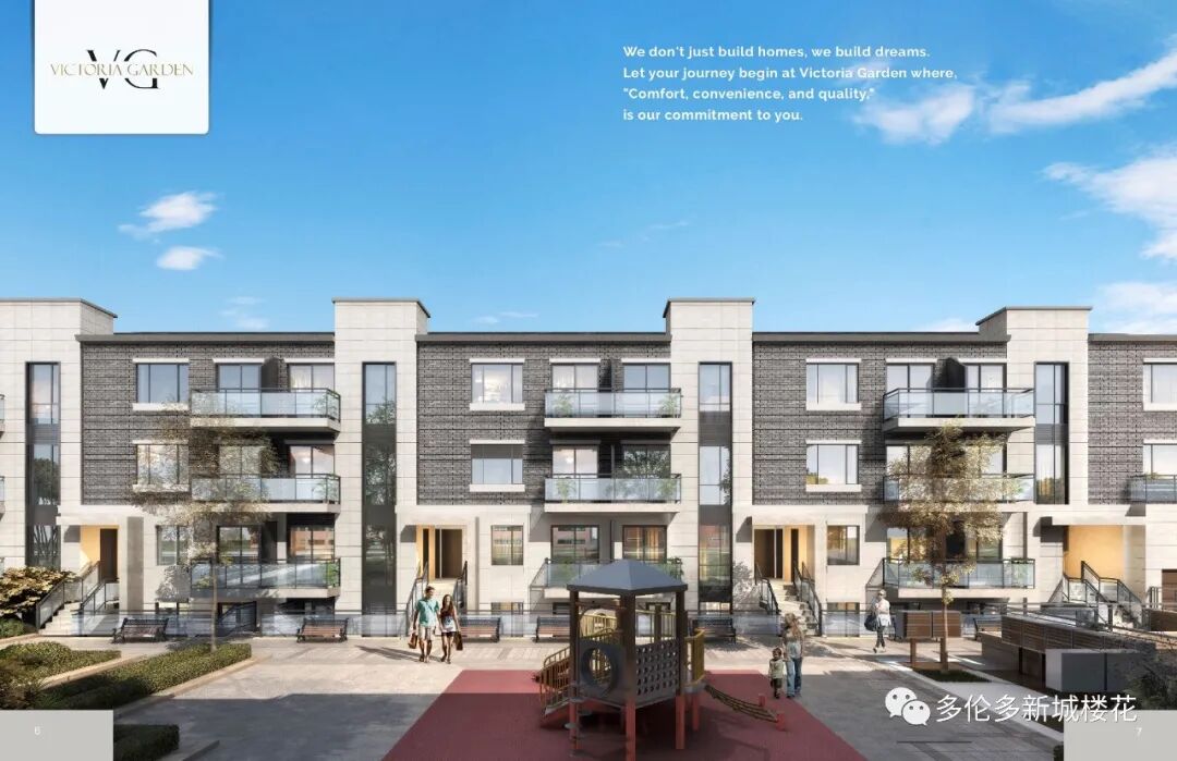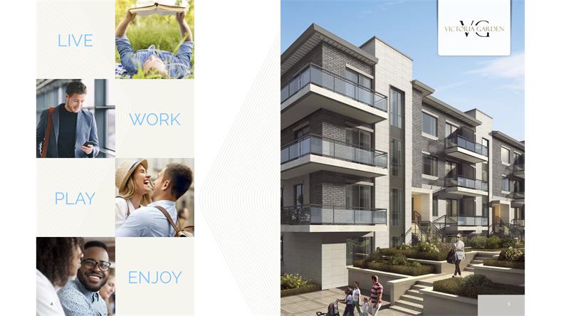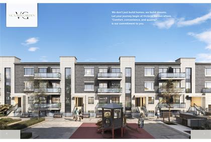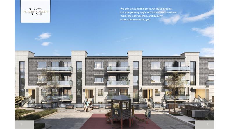 Victoria Garden Condo Townhouse 由多伦多著名开发商95 Development重磅开发打造,位于世嘉堡较为核心地区,靠近Finch街的Victoria Park中间地段,地理位置优越,跟北约克只有一街道之隔。“LIVE THE LIFE”是VG的宗旨,社区内的每栋楼都被绿化包围,还有一个户外儿童娱乐园,开发商立志打造一个集自然与生活于一体的居住社区。 01