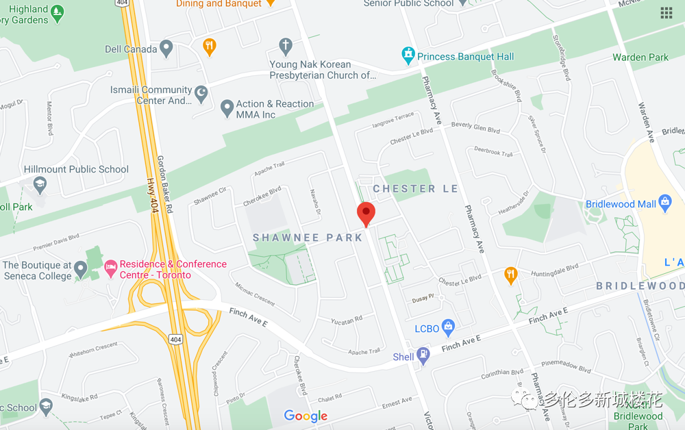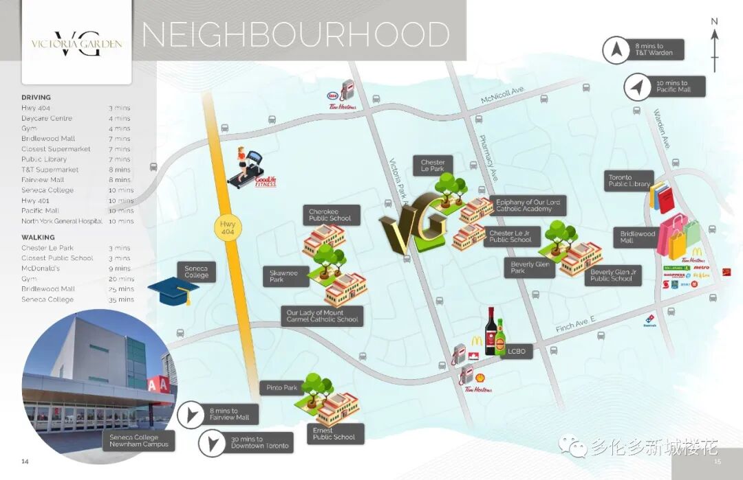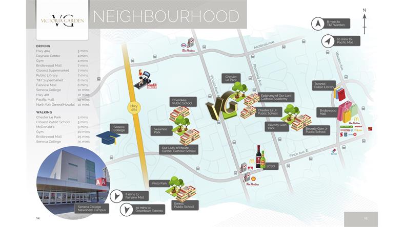 Victoria Garden,位于黄金地段 Victoria park/ Finch东北角 距北约克一街之隔,区位优势明显,多伦多最重要的交通干道SHEPPARD、404高速、401高速、FINCH大道、VICTORIA PARK大道在这里纵横交错,形成交汇地带,西接北约克、东望士嘉堡。10分钟到达地铁站,30分钟到达市中心!优等的教育资源,成熟的交通网络,自驾,步行,交通工具,四通八达!周边有商场、餐厅、图书馆、公园、健身房等多种设施。 2分钟 Chester Le公园、Closest公立学校 3分钟上Hwy404; 4分钟 托儿所,Goodlife健身房; 7分钟 Bridlewood商场,多伦多图书馆; 8分钟 Fairview商场、大统华超市; 10分钟 Hwy401、太古广场、北约克全科医院、Seneca College。 10分钟到Donmills地铁站 30分钟到多伦多市中心