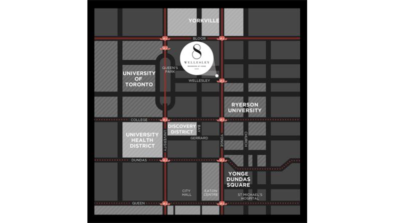 地理位置 8 Wellesley的地理位置可以说是风水宝地,隔壁即是女王公园和著名的奢侈品一条街Bloor St。它坐落在多伦多的中心点。不仅周围有着各类餐厅、商铺、银行、公园、健身房、医院等等设施可以满足居民生活需求,而且还靠近加拿大第一大学 — 多伦多大学的主校区。