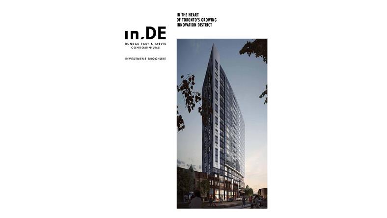 【楼盘名称】in.DE Condos 【 开 发 商】Menkes Developments 【房屋类型】公寓 【 总 层 高】29层 【 总 栋 数】1 【总单位数】205 【位 置】219 Dundas St E, Toronto 位于Moss Park社区
