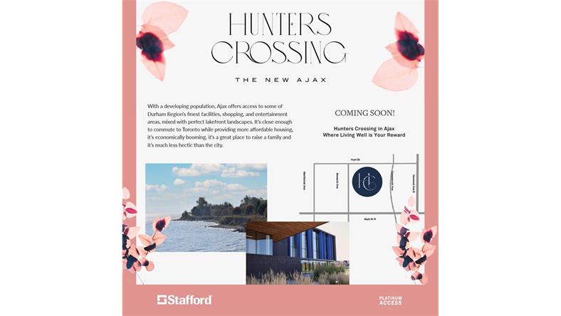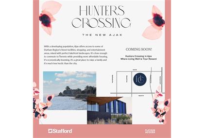 Hunters Crossing是由知名开发商Stafford Homes推出的全新无管理费镇屋项目,位于Ajax的中心地带Hunt St和Monarch Ave。邻近401高速,周边有餐饮,超市,购物,娱乐场所等,公交网络完善,交通便利,生活方便,性价比无敌。