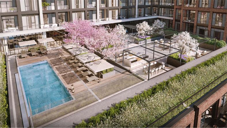 你可以在The Dupont公寓的屋顶露台边俯瞰整个多伦多市区边放松休闲,这里华丽的游泳池、池边小屋都给你带来五星级的度假体验,你可以尽情在游泳池里锻炼休闲、在户外进行烧烤、并欣赏葱葱郁郁的露台景观