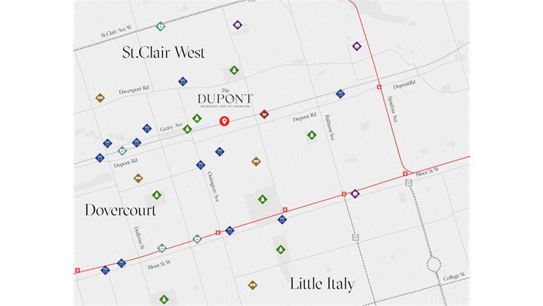 The Dupont Condos坐落在Dupont St.和Ossington Ave.的交界处,周边均为备受欢迎的市中心社区,例如Dupont Cultural Corridor,St. Clair West社区、The Junction社区以及Little Italy社区(小意大利),这些社区无论是饮食、娱乐以及文化方面都各具特色。从The Dupont Condos楼下就是Sobeys超市,往东一个路口即到达Loblaws超市。