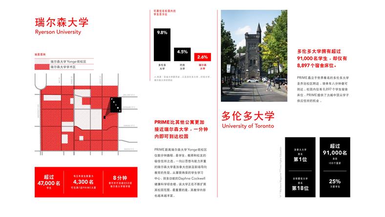 Ryerson大学位于多伦多市中心中心,同时也是加拿大、多伦多这座城市魅力与竞争力的缩影,是你沐浴智慧、碰撞活力、遇见未来的地方,是集美貌与智慧于一身的中心位置!但是由于学校校园位于多伦多市中心,宿舍实在有限仅有3栋,因此大约97%的在校生需要寻找校外住所。如果未来5年间Ryerson大学继续每年接受7000名学生的话,大约要12栋像Prime Condos这样的公寓大楼才能满足他们的住宿需求。