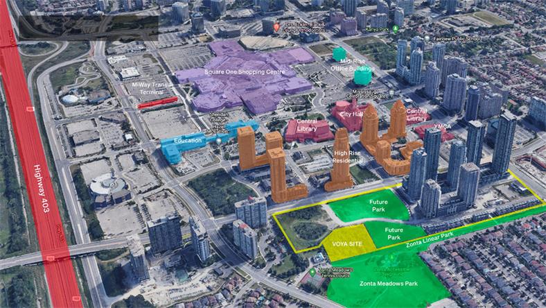 著名开发商AMACON巅峰之作VOYA豪华公寓,位于密西沙加两条主干道Burnhamthorpe Rd. 和Confederation Pkwy的交界处,Square One购物中心的西面。