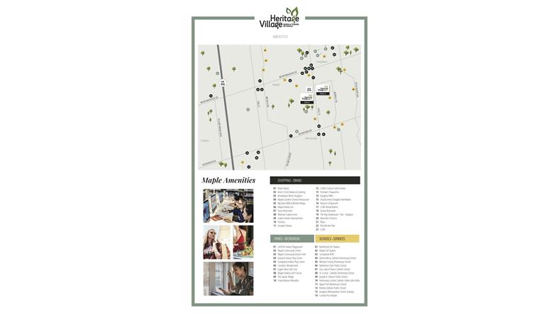 HERITAGE VILLAGE有适合任何年龄的孩子的教育机构。无论孩子是需要入幼稚园,小学还是中学,该地区都有公校和天主教学校可供选择。附近还有MAPLE LIBRARY公共图书馆可以借阅图书,仅需步行四分钟即可抵达。 DIVINE MERCY CATHOLIC ELEMENTARY SCHOOL MICHAEL CRANNY ELEMENTARY SCHOOL MACKENZIE GLEN PUBLIC SCHOOL OUR LADY OF PEACE CATHOLIC SCHOOL ST. CECILIA - CATHOLIC ELEMENTARY SCHOOL Heritage Village Laurier Homes新建的联排别墅和半独立式开发项目。经典的全砖建筑,开放式概念设计和大窗户结合了经典与现代的精华,可为您提供居家所需的一切。风格与灵活空间的无缝结合使Heritage Village与众不同。安静舒适,风景宜人,蓝调生活,宜居宜租。家庭精装实用三居单车库布局,高端联排及半独立屋任君挑选,建设两出停车位,精工细作,非凡之作。开发商以扩展起居空间为核心设计理念,并融合传统古典风情,布局考究,轻奢视感,休息区小而精,活动区大而简。无论是单身贵族、二人世界、三口之家、四人家庭,以及更大的家庭SIZE,Heritage Village 都可以为您找到最心仪的居家住宅。 开发商