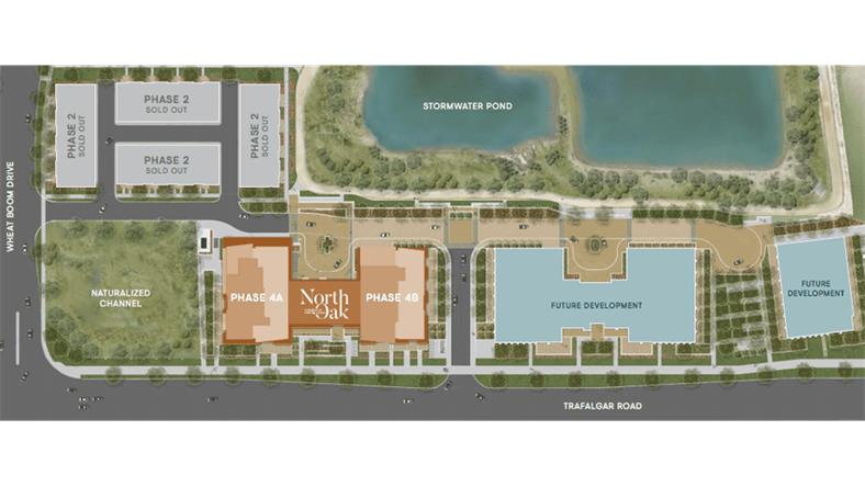 【项目名称】North Oak Condos at Oakvillage 【开发商】Minto Communities Canada 【地理位置】Trafalgar Road & Dundas Street East, Oakville 【交界处】King St E & Wellington N 【楼高】Phase 4A - 18 Storey Condo Phase 4B - 15 Storey Condo