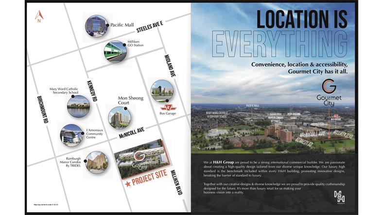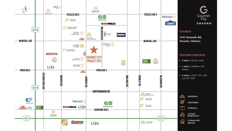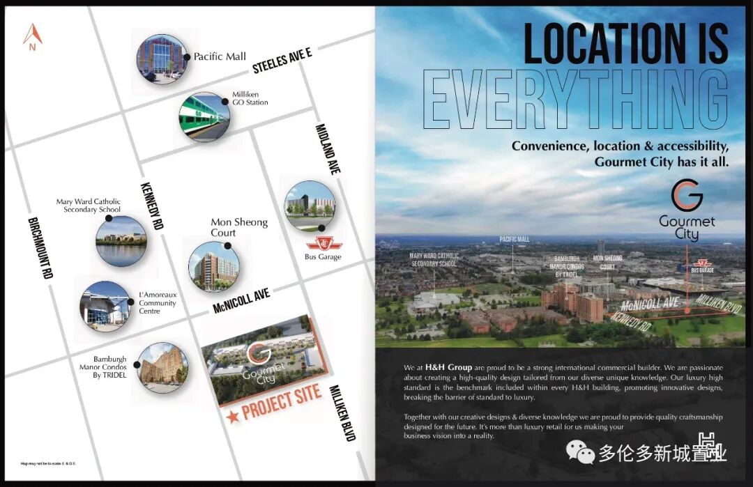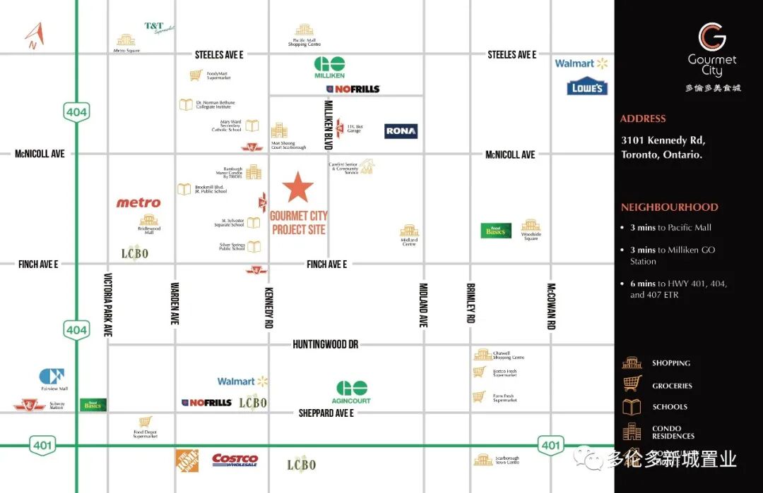 项目位于Kennedy Rd/McNicoll Ave,3101 Kennedy Rd,由H&H Group开发。项目向东贯穿到另外一边连通Milliken Blvd,处于整个地区的流量密集区域,3分钟到太古广场和Milliken go train station,6分钟到高速401/404/407,临街即是TTC Bus Garage与孟尝阁。Kennedy Rd/McNicoll Ave 价格出奇亲民,稳赚正现金流。价格由59万9起至89万9不等,面积由523至1026平方尺。 士嘉堡商业新盘核心区Kennedy/Mcnicoll 这个项目适?于用?餐馆, 奶茶店, 诊所, 零售, 美?美容?发店等多?用种?途;共60余席, 其中仅一半可做餐饮用途,先到先得! 处于整个地区的流量密集之地 北面隔一条街就是太古广场 投资今日, 坐享未来! 值得购买: 【理由一】:投资回报率高的商业盘: 旺铺高租金,多用途商业中心(美食、娱乐、购物、保健等)经营范围灵活,自营、出租最佳之选。 【理由二】:华人购买力高分区: 周边独立屋/高档公寓/镇屋林立(近3000户)、TTC巴士总站、学校、养老中心和社区中心,人流量密集。 【理由三】:黄金地段: 近十字路口,比邻TTC巴士总站,3分钟到太古、GO Train,6分钟上401/404/407,快速带来远、近客流。 综上所述,位置优越、人流密集、购买力强盛的区域的商业楼花的投资回报率非同凡响。但是,现在位于大多地区人流密集地的商业楼花买少见少,越来越稀有了。所以市场上一有这种类型的商业盘推出,马上就被投资人一抢而光,所谓“手快有,手慢无”。 超延长付款方式: 签约付1万;30天付5%;120天付5%;510天付5%;交付时付10% 管理费:$0.4/尺 免费转让