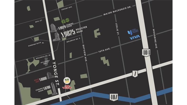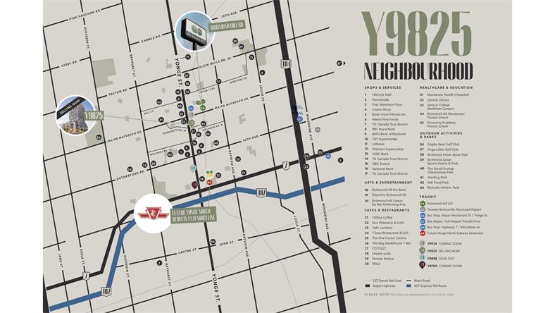 项目名称:Y9825 地址:9825 Yonge St Richmond Hill ON 建筑类型:Condominium-1~3卧室&镇屋 楼层:22层 总单元数:451套 价格:40余万起 开发商:Metroview Developments 交房时间:2025年秋 Y9825 Condos项目位于列治文山市中心的Harding社区,紧邻多伦多南北龙脉Yonge St.,位于Yonge St & Harding Blvd W的交汇处,坐落于大多伦多地区交通最为繁忙、贯穿南北的Yonge Street地铁延长线上。Y9825 Condos 公寓门前公交线路直接连接Langstaff GO 火车站,开车可快速进入404和407高速公路。Yonge街地铁延长线未来也将在此设立站点,未来的列治文山中央车站将成为Hwy7 / Yonge St 以北居民的重要枢纽中心,这里是列治文山最炙手可热的黄金区域。 紧邻Yonge Street,楼下就是车站直达Go Stations 开车3分钟到Richmond Hill Go Station 快速到达高速404及407 开车10分钟到Lanstaff Go Station 附近有Red Maple小学和Lanstaff中学 交通便利,快捷餐馆,咖啡馆,Hillcrest商场,电影院 步行就可到达大统华超市及各类餐馆等 举步未来地铁延长线入口 教育资源优质,毗邻Red Maple小学和Lanstaff中学 举步可到达大统华超市及各类中餐馆西餐馆等 附近公园包括Huntington Park, Bayview Reservoir Park, Cakebread Park等 区域内拥有一流的高尔夫俱乐部,附近的Uplands Glof Club冬天还能滑雪。 Walmart super centre,best buy, golf club, silvercity, 一站式生活就在家门口!