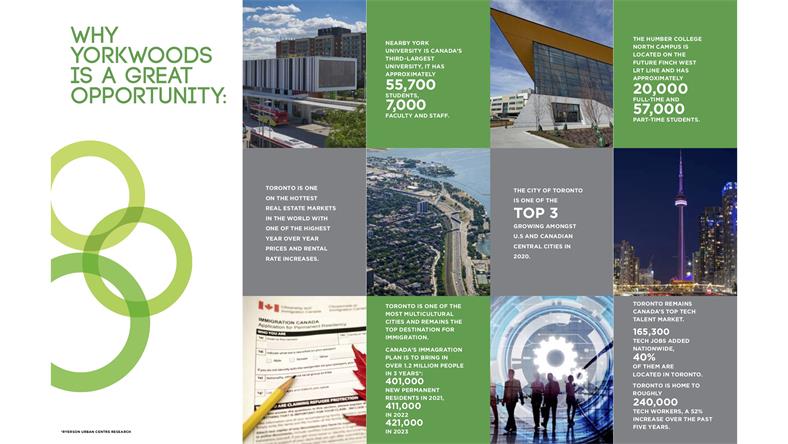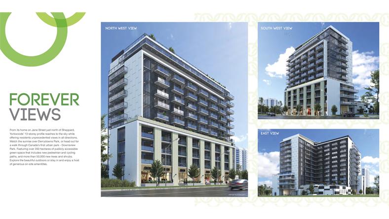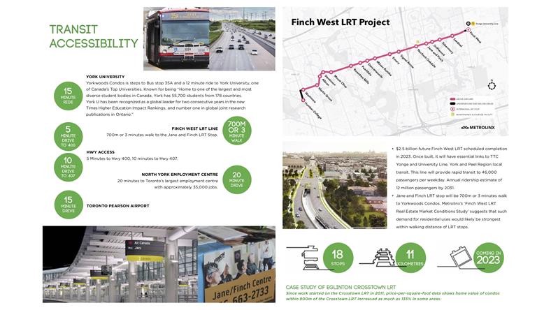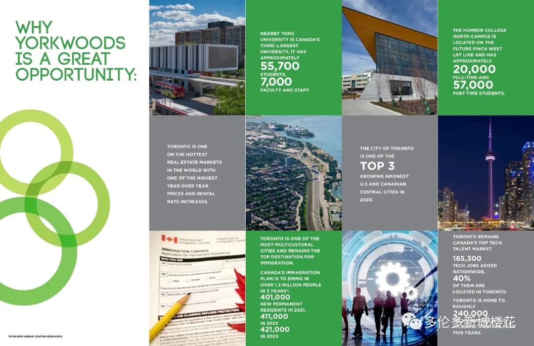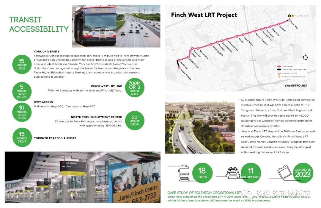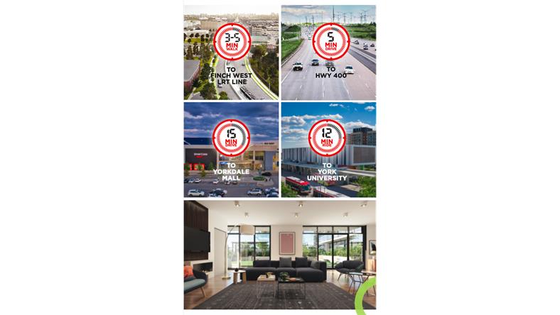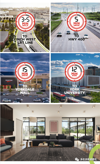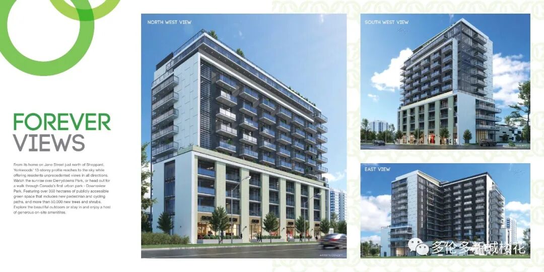 Yorkwoods Condos是 CTN Developments 的新公寓开发项目,位于 2839 Jane St(Jane St & Finch Ave)。Yorkwoods Condos 共有 190 个住宅单元和零售空间,单位的面积从 464 - 1109 平方英尺的单卧室到 3+书房的卧室布局不等,可满足各种买家的需求。 【楼盘名称】Yorkwoods Condos 【开发商】CTN Developments 【建筑商】 Atif Aqeel Architect Inc 【地址】2839 Jane Street, Toronto, ON 【类型】Condo 【楼层】13 层 【单元数量】190套 【价格】50余万起 【单位面积】532 - 820 SqFf 【交房日期】2024年8月 Yorkwoods Condos是一座现代住宅,位于城市西北端的一个家庭友好社区,交通便利。提供许多城市设施和宽敞的套房,靠近学校,绿地,通勤选择和生活方式设施,这将是多伦多中少有且最能被负担得起的社区之一。距离约克大学仅12分钟路程,这也将是学生们完美校外生活最好的选择之一。日托,医疗设施,社区中心,游乐场景点,包括Black Creek Pioneer Village都位于附近。使其成为投资者和首次购房者在这个新兴地区购买的动力。 这个适合家庭入住的地区是许多 TDSB 和 TDCSB 教育机构的所在地,其中一些机构离家仅几步之遥,这使得 Yorkwoods Condos 成为有小孩的家庭的理想之家。距约克大学仅8分钟路程,这也是大专学生的完美校外生活选择。当地日托、医疗设施、社区中心、游乐场和景点,包括 Black Creek Pioneer Village 都位于附近。周围还有许多自然绿地可供探索,包括 Derrydowns 公园和邻近的高尔夫球场,供狂热的高尔夫球手享受。 Yorkwoods Condos 的居民将能够享受无缝通勤,因为该地区与交通选择和主要干道高度相连。居民可方便地前往 TTC 巴士路线,距离前门仅几步之遥。 步行3分钟或700米到即将投入使用的Finch West LRT轻轨,可快速将乘客连接到地铁