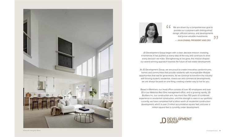 优质设计,创新工艺,长期价值。兼顾到合作伙伴、投资者和居民的各种利益和需求,JD 开发集团战略性地将具有高潜力的理想地点转变为繁荣的社区。通过在安省建立多个精心规划的社区,JD正在重新定义景观,创造更美好的生活方式。十多年来,JD一直往这些目标前进。